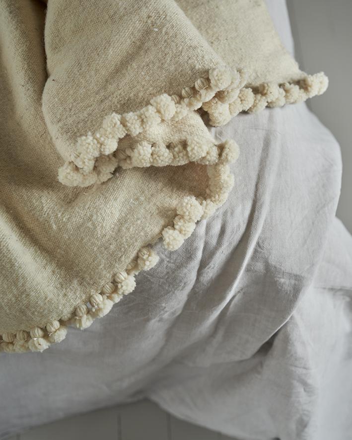 Mina Ben Miled is the proud artisan making these wonderful thick wool throw. Warm white, warm grey/brown and then the lovely striped one- accompanied by very sweet bobbles. We love it on the bed and in the sofa!